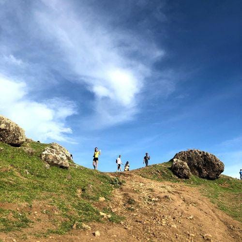 The hill itself is covered in soft grass and low shrubs, with a few scattered rocks that naturally become sitting spots. In the dry season it turns golden, giving the landscape a slightly African‑safari feel. In the rainy season it turns green. This is part of the visual rhythm that people love. The soft curves of the hill, the contrast between the savanna and the deep blue of the sea, and the way the sky changes hour by hour create a quiet drama that is hard to replicate anywhere else in Lombok.